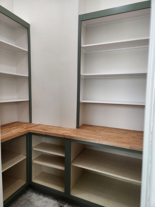 Terra Cotta cabinets and a laminate countertop – This 12 foot run of all wood cabinets is so much more useful than the old particleboard storage cabinets which were falling apart. The owner now has both storage space and work space.