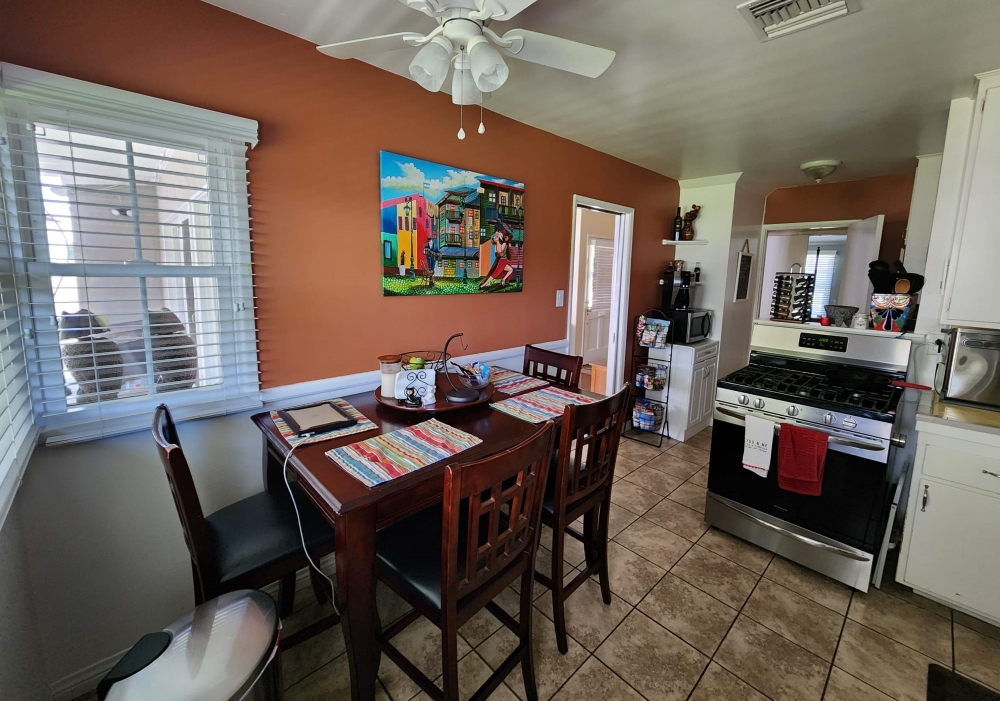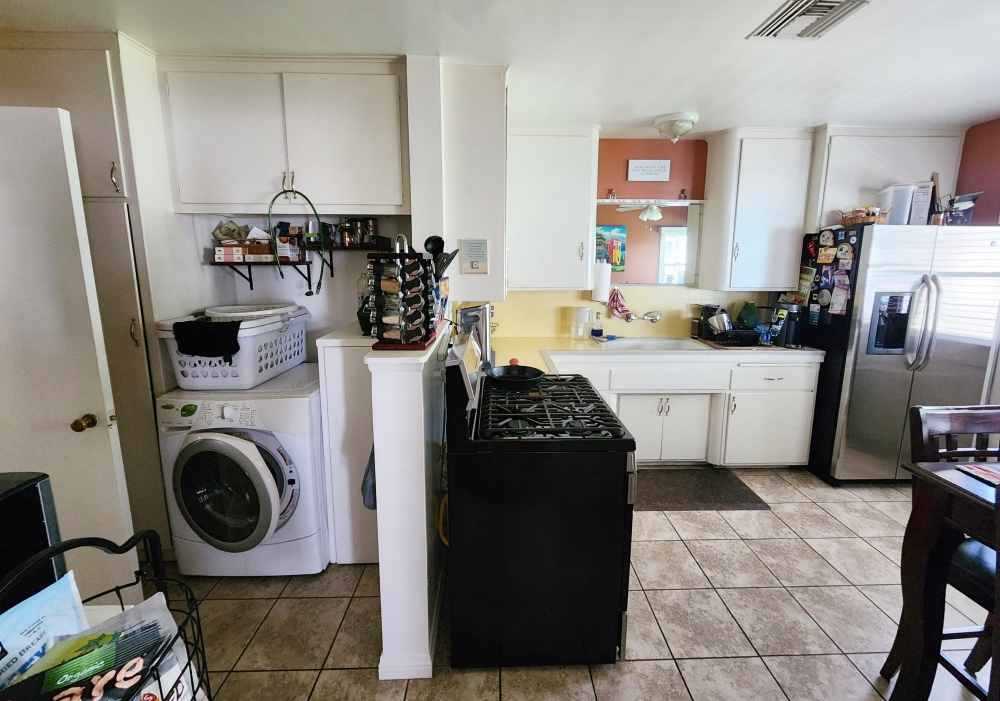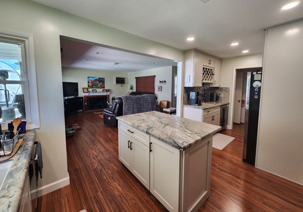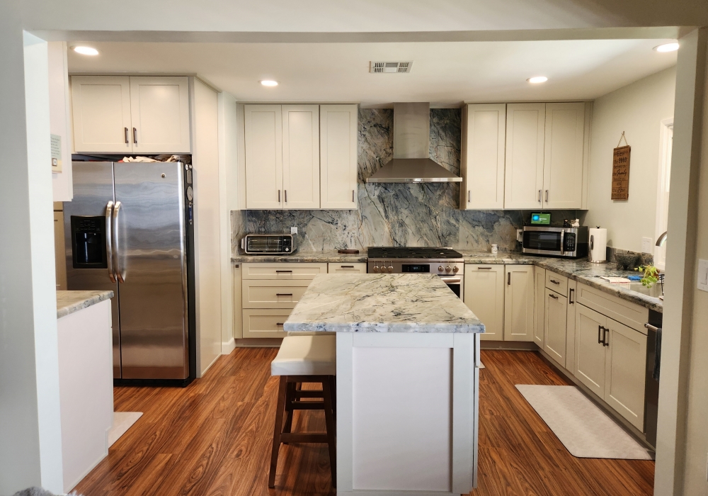 Sand Dollar Shaker cabinets with Ijen Blue quartzite – This 1950s older home had a wall between the living room and kitchen. The washing machine and dining area shared the space with the enclosed kitchen. In addition, there was only a small countertop space by the sink, and no countertop to the left of the stove. The goal was to increase the countertop, storage, and openess of the space. We first started by removing most of the wall between the living room and kitchen (leaving just enough wall for the wet bar). We removed a door to the exterior (in order to gain a corner for cabinets and countertops), and recentered the main window on the new exterior wall (the second smaller window stayed in the same location and can be seen in the photos). Then, we relocated the washer to the garage, and relocated all the appliances to different walls. The new sink location allows for a view to the backyard (rather than a wall), the new stove location allows for countertop space on both sides, and the new refrigerator location allows for the doors to open without hitting the side wall. Removing the old water heater closet allowed for a large pantry, and removing the old forced air heating closet allowed for a wet bar. Moving the countertops and appliances to the perimeter walls allows for an open center and space for the island. By using the quartzite for the backsplash as well as the countertops, it creates a beautiful focal point behind the stove and makes cleaning splatters much easier.