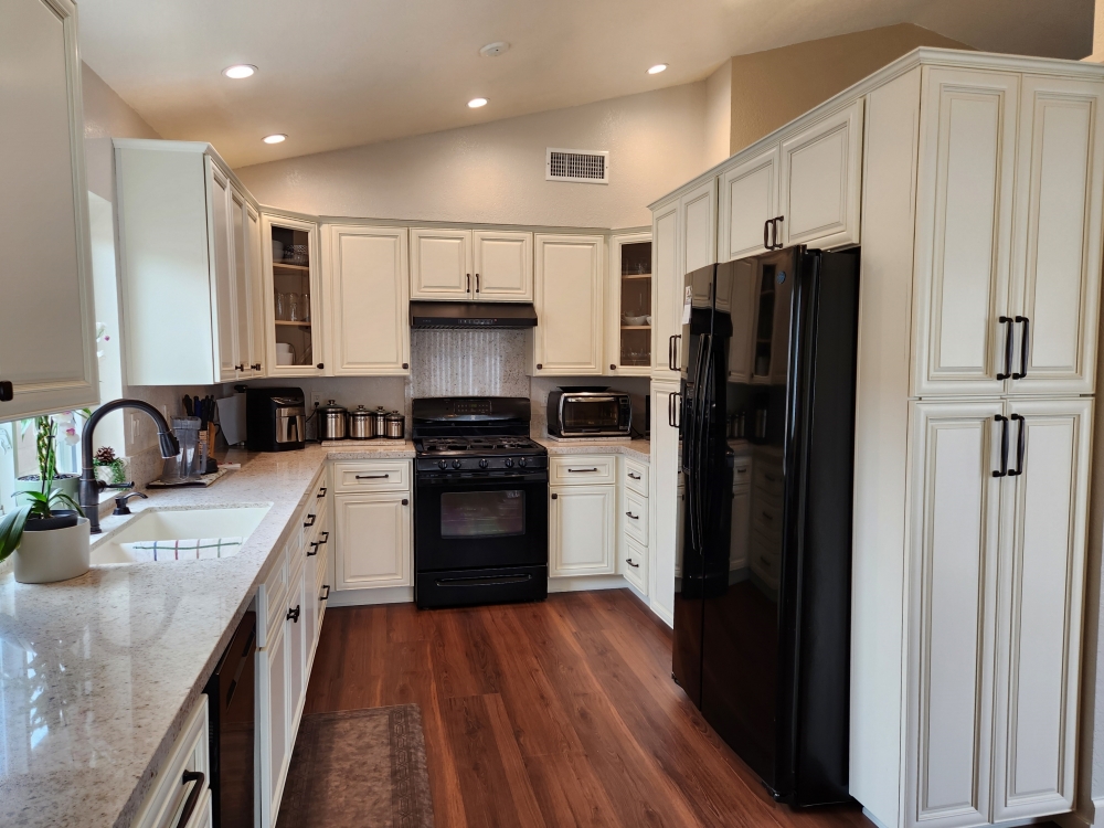 Semi-custom Faye cabinets from Kemper Cabinets with Nautica Ivory quartz – Although the original builder cabinets were not that old, they were made of Thermofoil and particleboard, and were starting to fall apart. Since they did not go all the way to the ceiling, the open space collected dust. The owners found a photo in a magazine and we worked to recreate the feel of it. The wall cabinets are now double stacked with lighted glass cabinets in the top. The golden perimeter cabinets have black handles, and the dark gray island cabinets have gold handles. The cabinets now have organizational accessories such as roll-out trays and a pull-out double trash can. Large crown molding adds elegance to the kitchen. The sink is now a large one bowl dark gray sink with a gold faucet (rather than the standard white double bowl sink). To continue the theme of golds, dark gray, and ivory, the countertop is ivory with caramel and gray veins. The 30 inch wall oven and cooktop were replaced with a new 36 inch wide free-standing range. The microwave was relocated to the island. This allowed for a black and gold chimney hood to become the focal point. If you zoom in, you can see that all the walls (including over the sink window) are covered with individual shiny ivory tiles in a herringbone pattern. The island was extended both in length and width. It now has cabinets on the back side (in front of the stools) for additional storage. There is now an overhang on both the back and one side for additional stools and ease of conversation. By using an aluminum subtop for the island instead of plywood, we were able to have overhangs with no corbels or legs getting in the way.