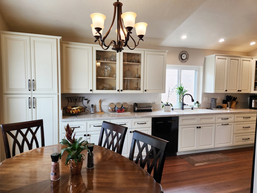 Vanilla cabinets and Wavy Sand quartz – The original space had a small kitchen and a large dining area. The sink peninsula stuck out into the walkway (creating a “pinch point”), and the refrigerator door could not open properly due to being too close to the side wall. The owners needed more storage and countertop space. By thinking of the space as one large space rather than two smaller spaces, we were able to extend the cabinets and countertops along one wall into the former dining space. This resulted in a lot more countertops and storage. Instead of one 12 inch deep pantry, they now have two 24 inch deep pantries. The refrigerator was located away from the corner, and instead of just a side panel, we installed a shallow “broom closet” pantry. In the prior layout, it was confining for more than one person to be in the kitchen space. But now, several cooks can be in the kitchen without bumping into each other.