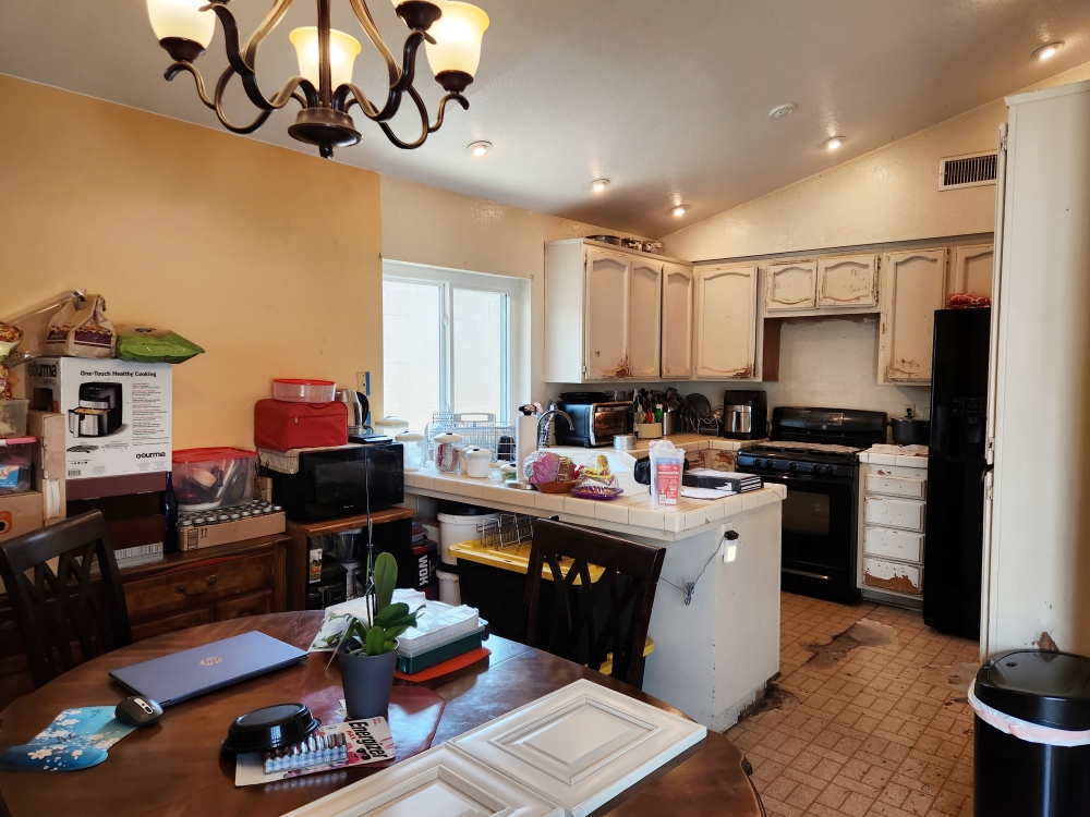 Snow Traditional cabinets and Mandala Supreme marble – The original kitchen had an additional full height wall (already removed in the before photo). There was only a narrow opening from the entry to the kitchen, and from the dining room to the kitchen. The full height wall was eliminated to allow for a breakfast bar. The breakfast bar legs are 9 inch wide cabinets to allow for quick storage cubbies for children toys. The new stove and microwave are located where the old entry opening had been. A bank of pantries by the garage door provide additional storage. In the lower right corner, you can see a peak of the corner storage bench (which is located under a window) to create a breakfast nook. In the bottom photo, you can see a portion of the beverage center which replaced an old coat closet.